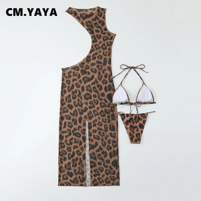 CM.YAYA Women Beach Bikini Set with Cutout Leopard Printed Sexy Long Bodycon Swimsuit Three 2 Piece Set Swimwear Bathing Suit