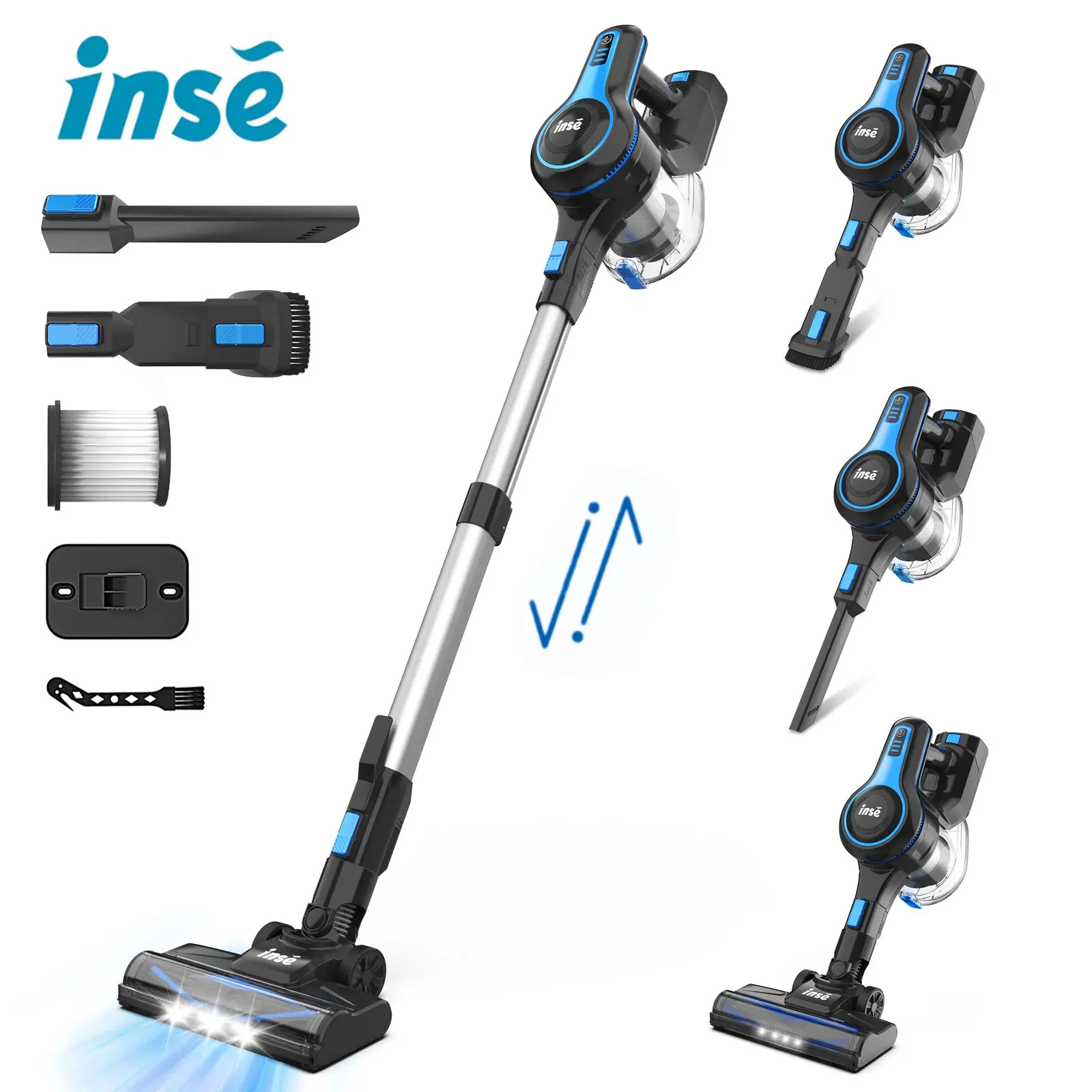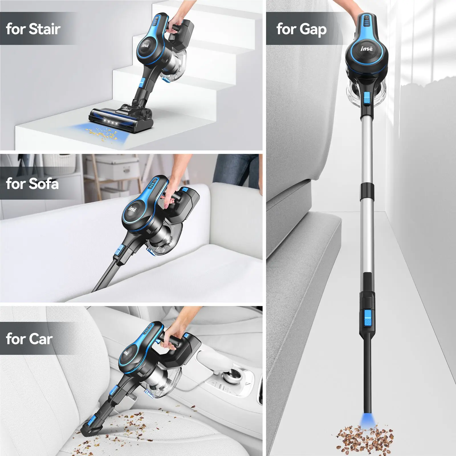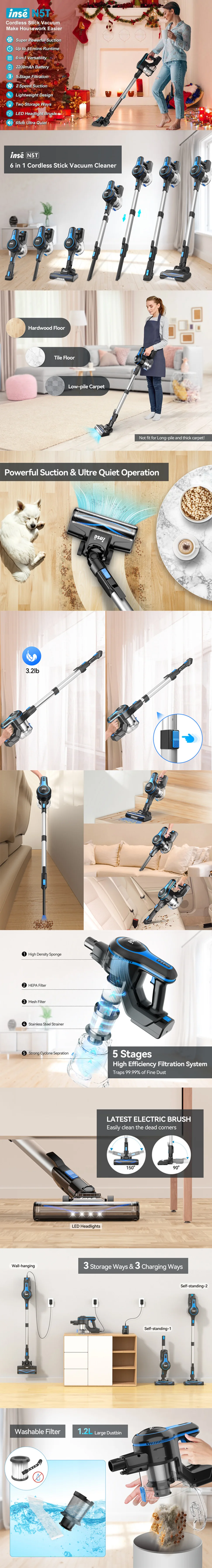 The Inse N5S cordless vacuum cleaner comes with multiple accessories and can be combined in 6 different ways to clean floors, sofas, curtains, desks, and other occasions without any problems.