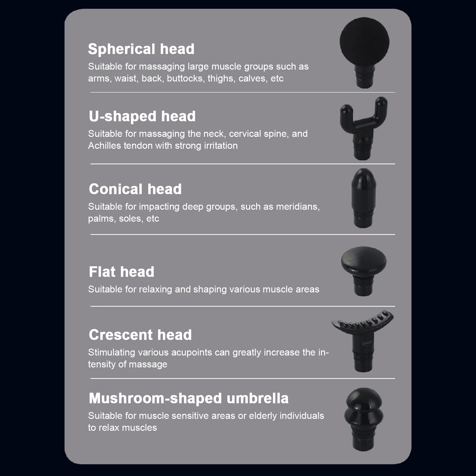 Equipped with 6 massage heads, for example, ball head for large muscle group massage, flat head for abdominal/arm/thigh line carving and relaxation, U-shaped head for shoulder/neck/spine tendons, and cylindrical head for pain point/palm/foot, etc.