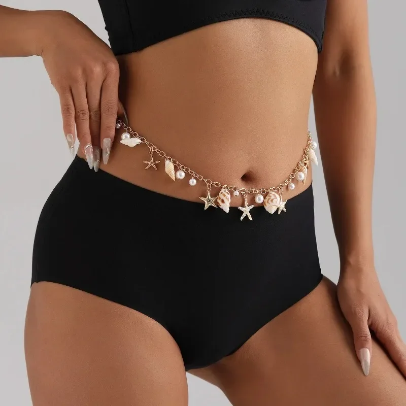Fashion Natural Shell Conch Sea Star Imitation Pearl Tassel Pendant Waist Chain for Women Sexy Boho Summer Chain Belt Necklace