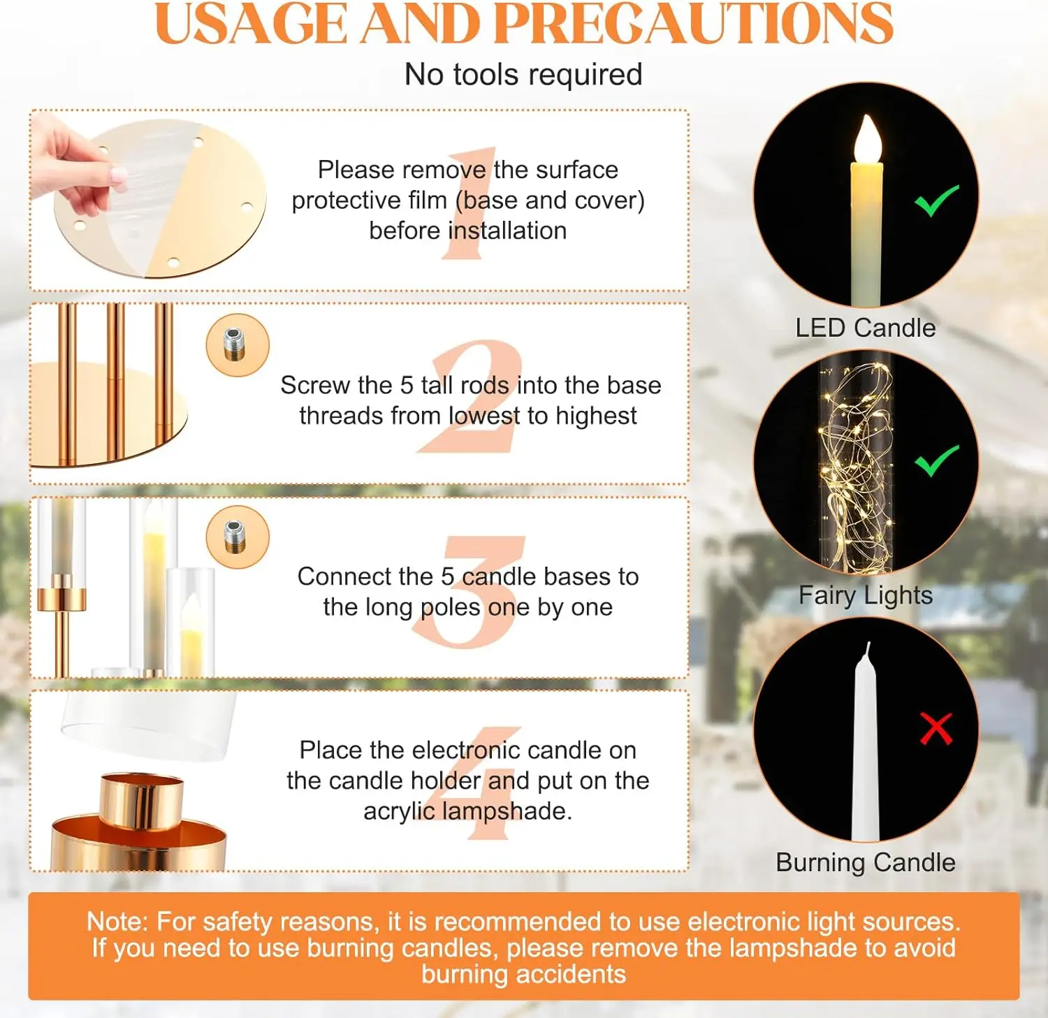 Gleaming Gold Charm: our 5 arm candelabra, with its radiant gold finish, is designed to hold electronic candles, each arm crowned with a transparent acrylic shade for a touch of elegance; The lamp shade is flammable, to prevent accidents it is recommended to use an electronic candle or remove it