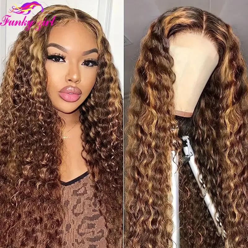 Highlight Honey Blonde Water Wave Lace Front Human Hair Wigs 13×4 Transparent Lace Frontal Wig Deep Curly Ombre 4/27 Lace Wigs