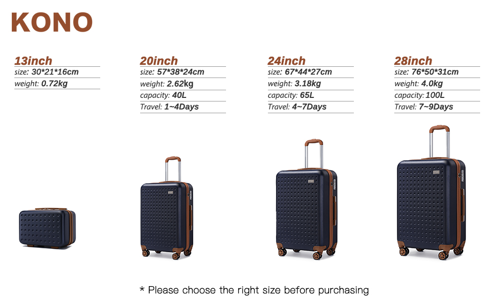 The Kono brand is moving towards the perfection and innovation of luggage. People who love travel or outdoor activities appreciate us very much. Our goal is to make your journey effortless and comfortable. All types and sizes offer more choice for your business traveling, international and national traveling, school and air travel.
