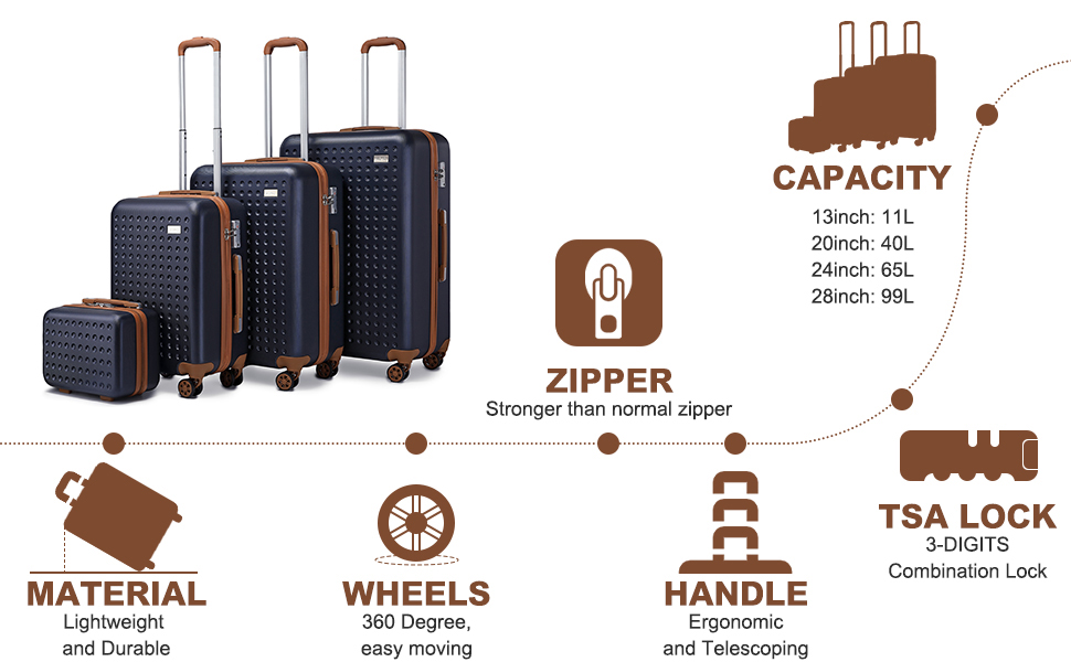 The Kono case set is made of high quality polypropylene material. Polypropylene (ABS) is mainly suitable for aviation products. It has the characteristics of anti-stepping, anti-fall, explosion protection and high toughness, which can rebound immediately after a collision to protect the luggage.