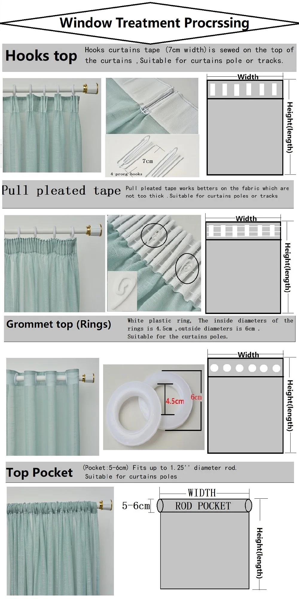 It can be use hook ,pull pleated and rod pocket three-purpose.Suitable for curtains pole or tracks.