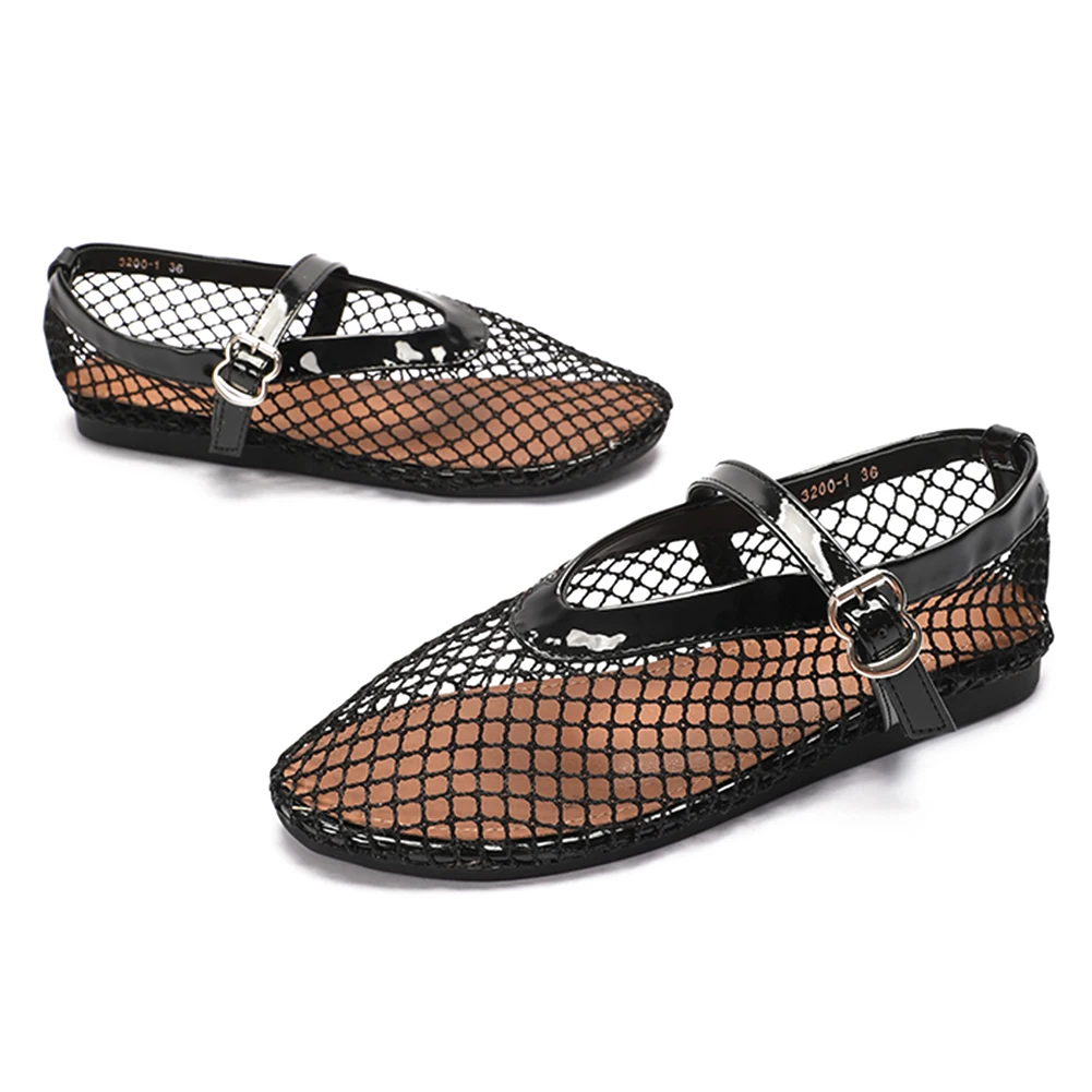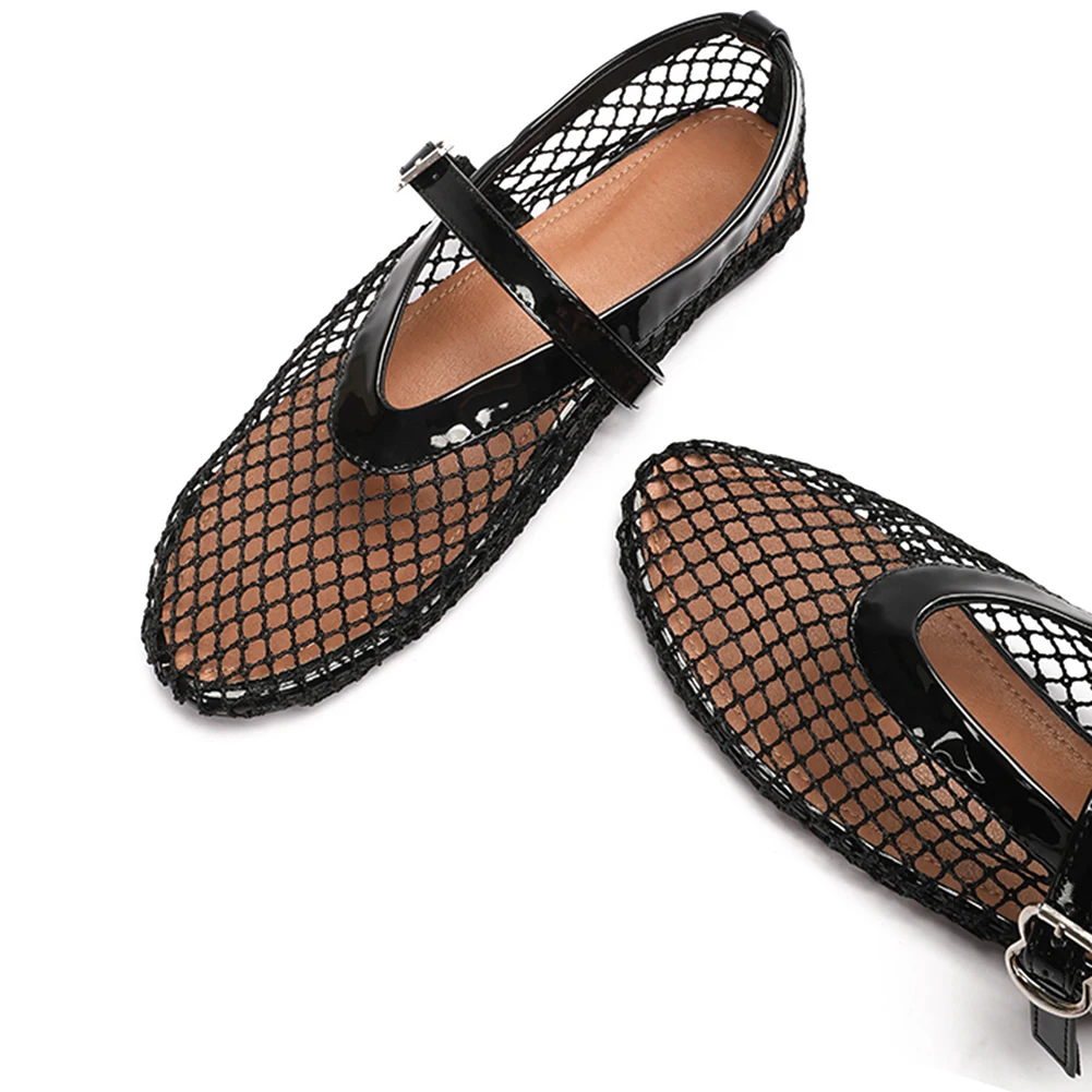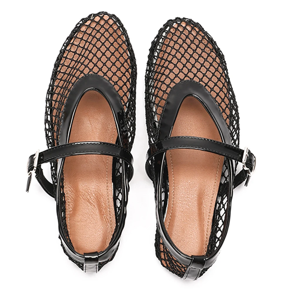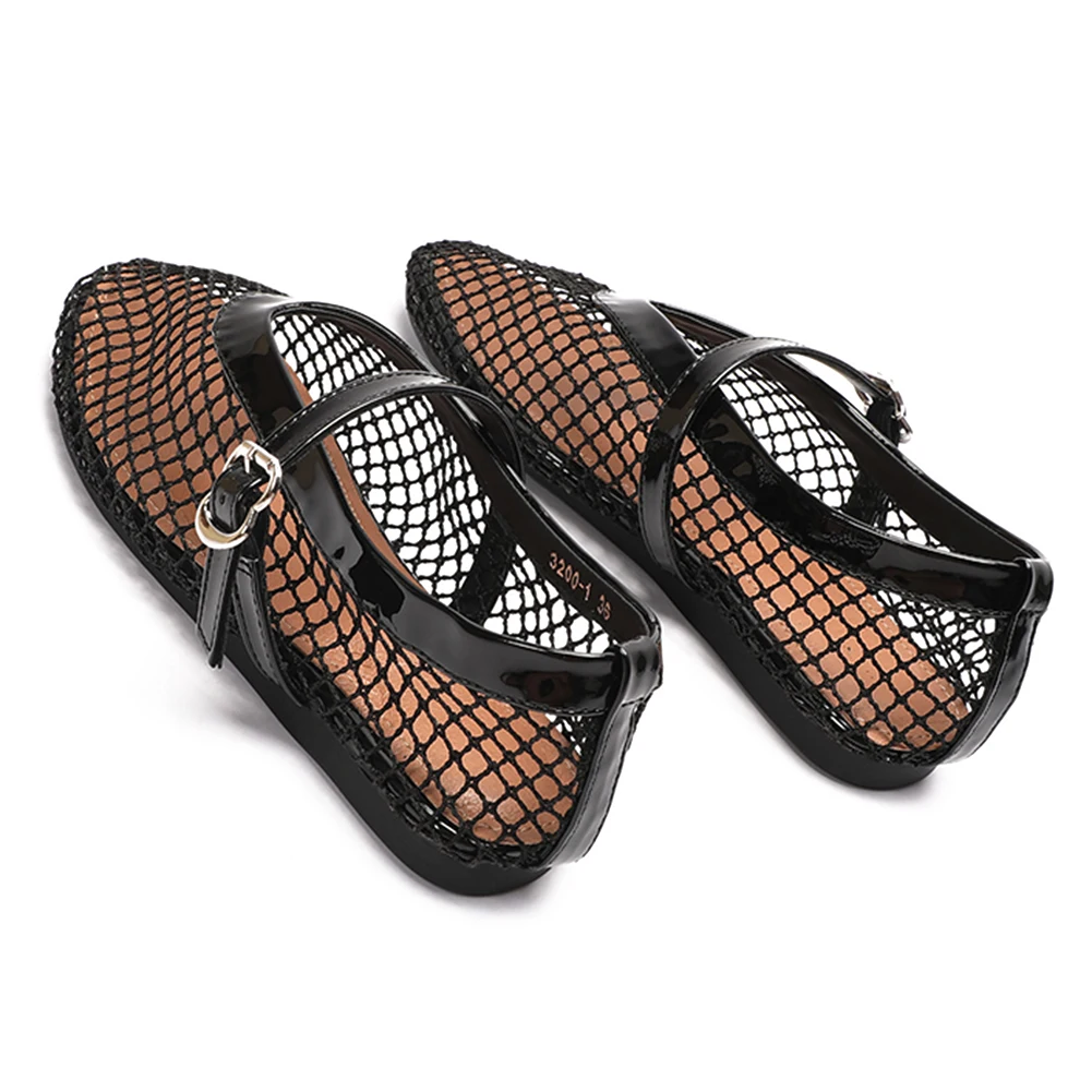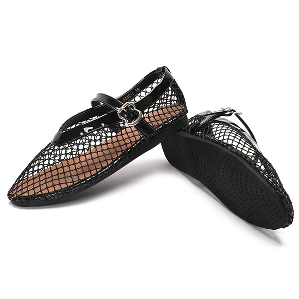 Women Mesh Ballet Flats Fishnet Ballerina Flats Comfortable Slip On Ballerina Shoes Buckle Strap Round Toe Ballet Shoes for Outdoor Travel