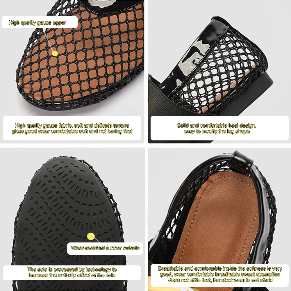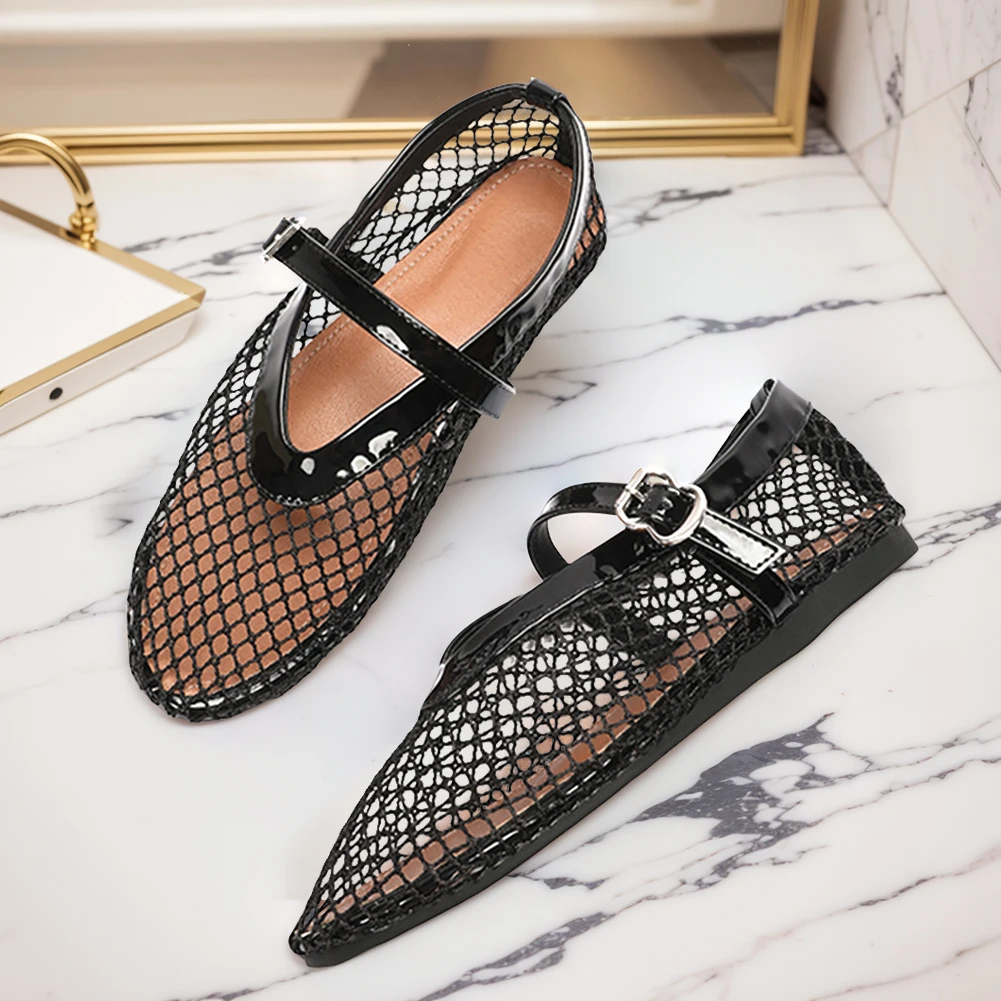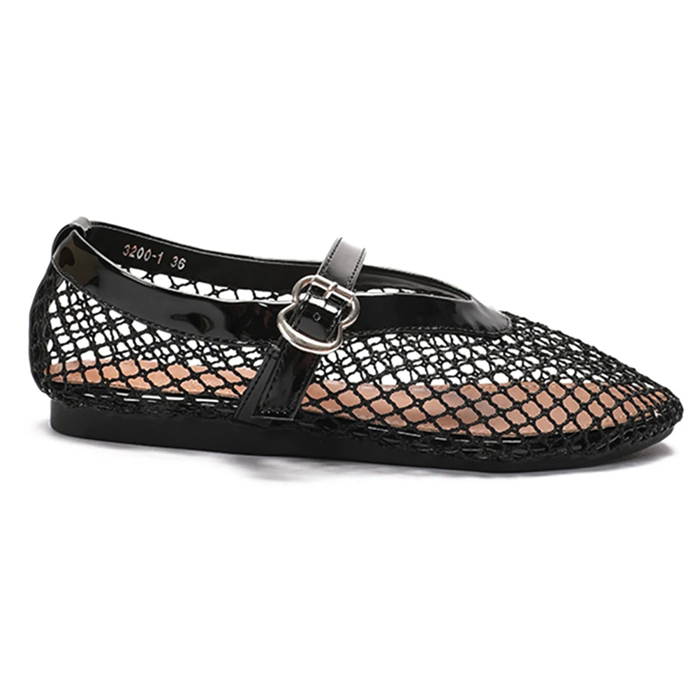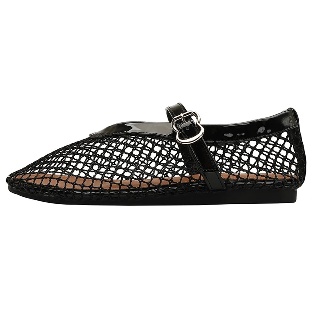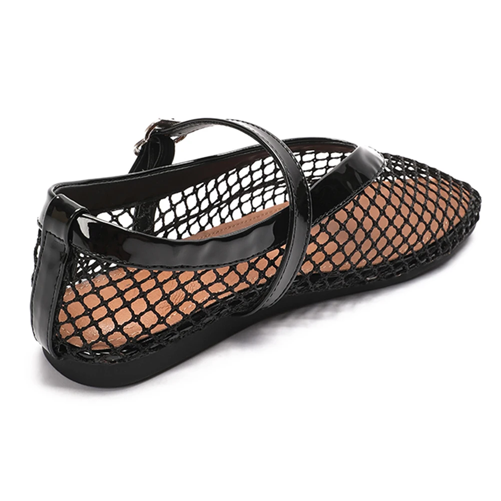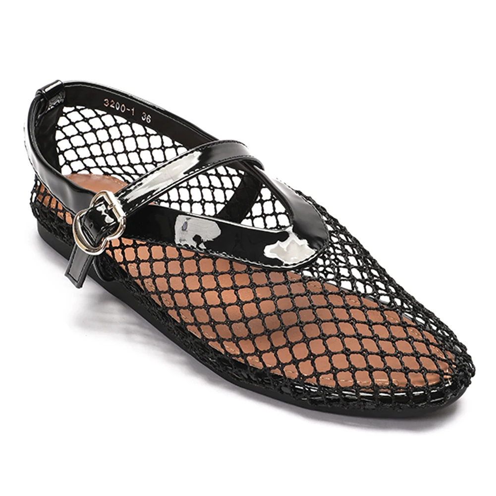 Women Mesh Ballet Flats Fishnet Ballerina Flats Comfortable Slip On Ballerina Shoes Buckle Strap Round Toe Ballet Shoes for Outdoor Travel